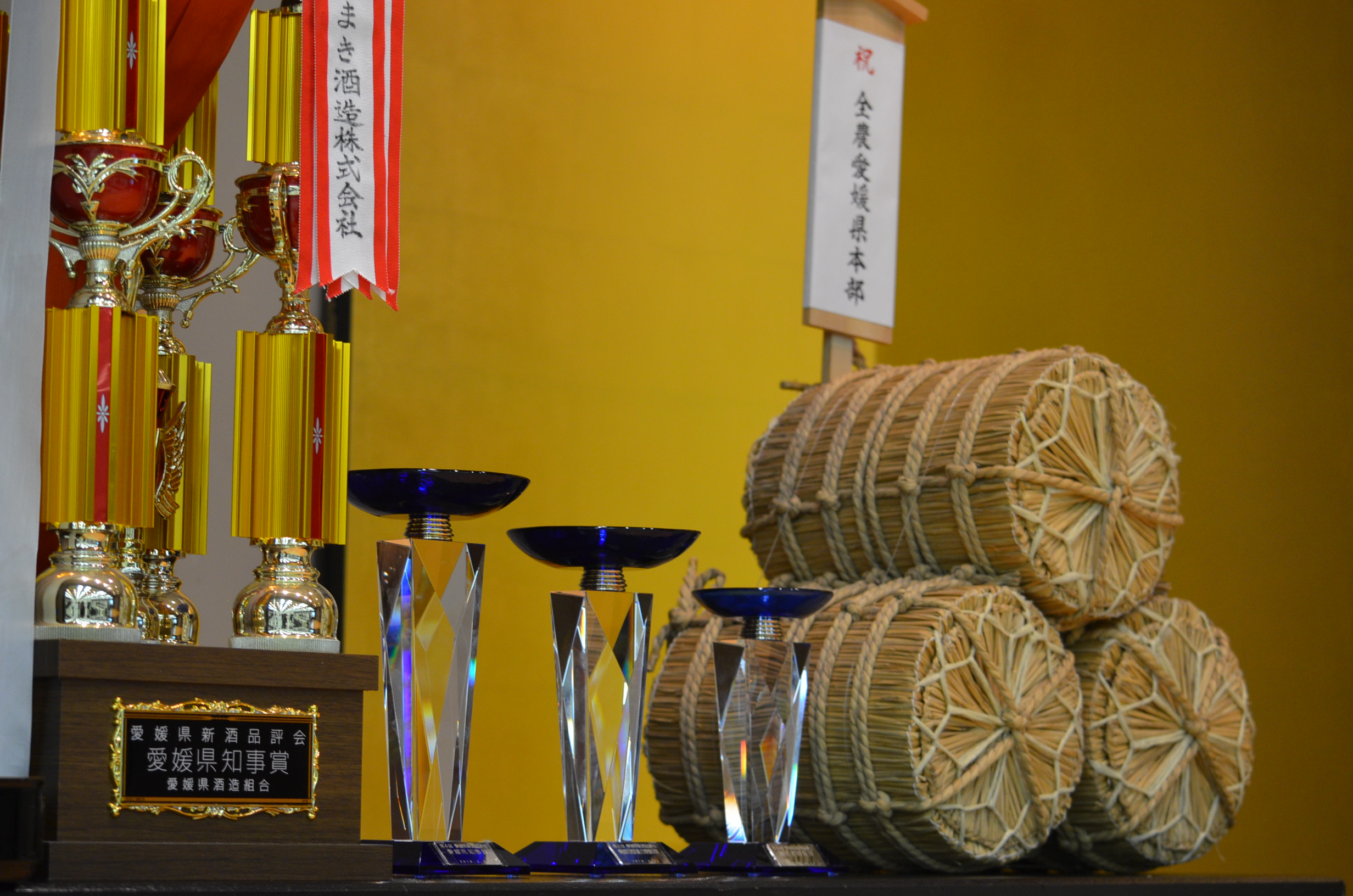 3月23日(金)、全国新酒鑑評会への登竜門である愛媛県新酒品評会が四国道後舘(松山市・道後温泉)にて開催されました。審査部門は大吟醸の部としずく媛(愛媛県初の酒造好適米を使用)の部の二部門。15蔵元が参加し、大吟醸の部39銘柄、しずく媛の部20銘柄、計59銘柄が出品されました。