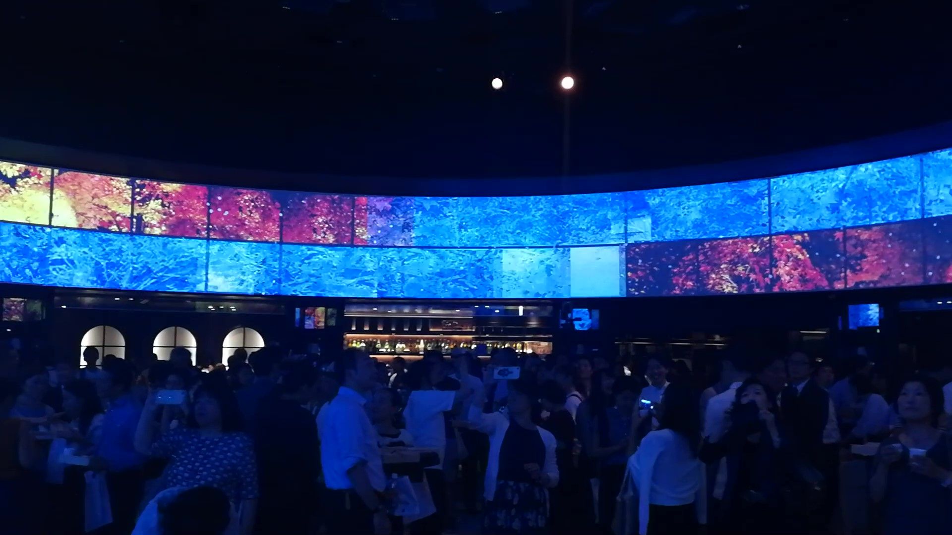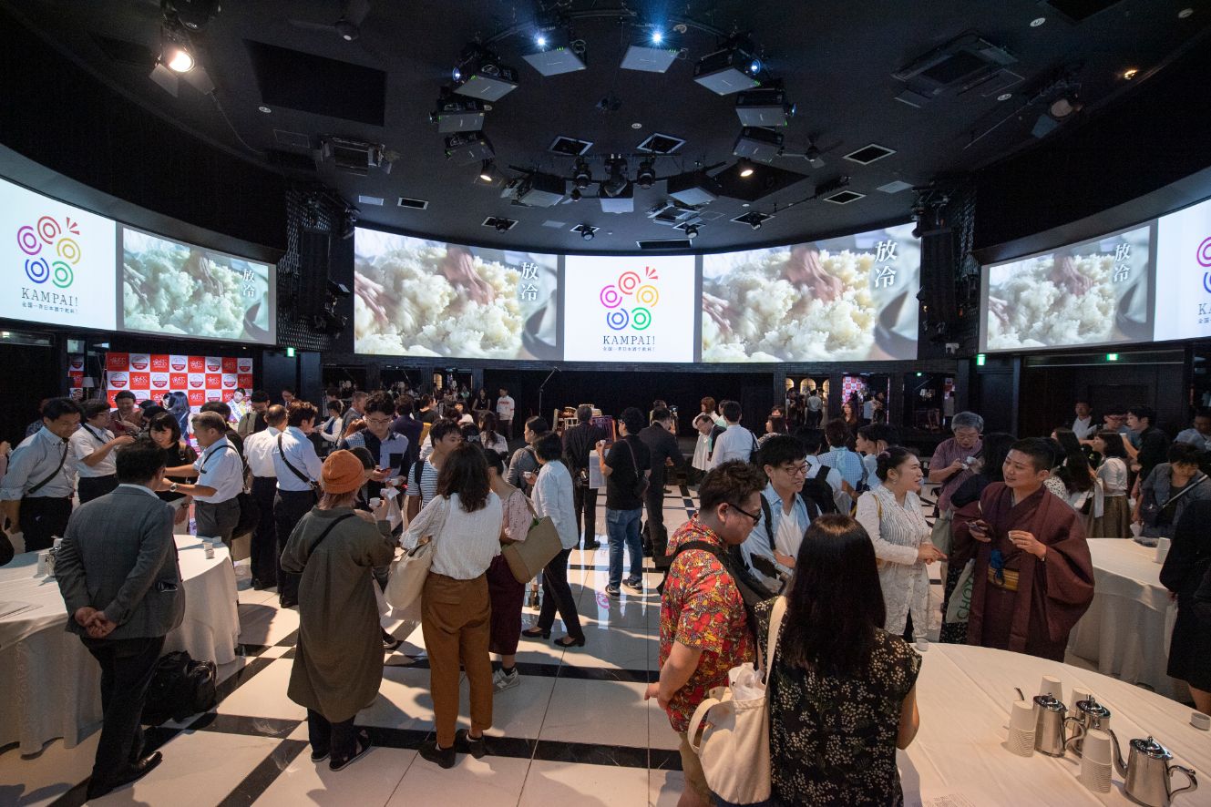 第二部(18:40~)からは、招待客50名に20歳以上の若者を中心とした一般参加者が加わり、360度スクリーンに「日本酒の作り方」の映像が流されて、ウェルカムドリングを片手に入場、ウェルカムミュージックで華やかにスタートしました。