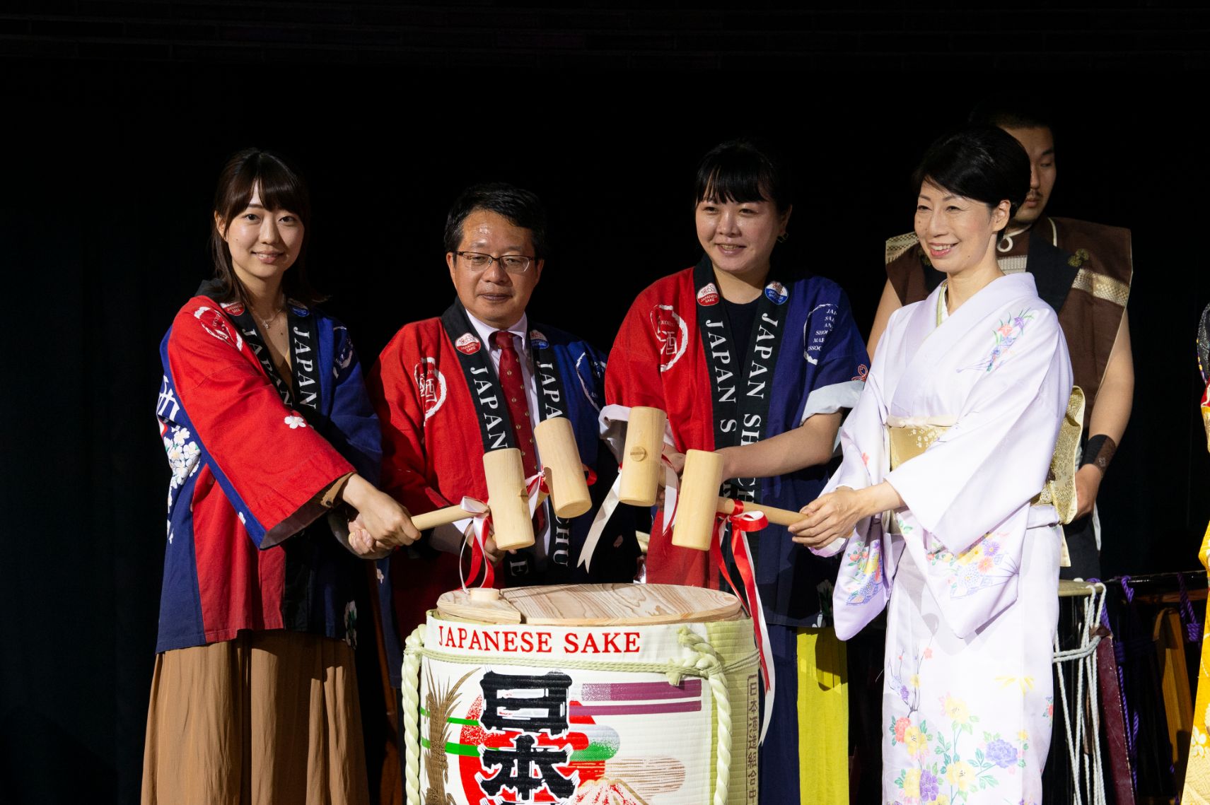 後半は、最大800インチ相当・360度巨大パノラマスクリーン映像と5.1ch対応の音響による演出、津軽三味線奏者・作曲家の雅勝さんと和太鼓奏者 千代園 剛さんコラボの伝統芸能パフォーマンスが披露され、新しい日本文化と日本酒の楽しみ方を満喫しました。最後に、主催者を代表し、日本酒造組合中央会 需要開発委員会 委員長 七田 健介氏より中締めの挨拶。参加者全員で、記念写真を撮影。エンターテイメントと、