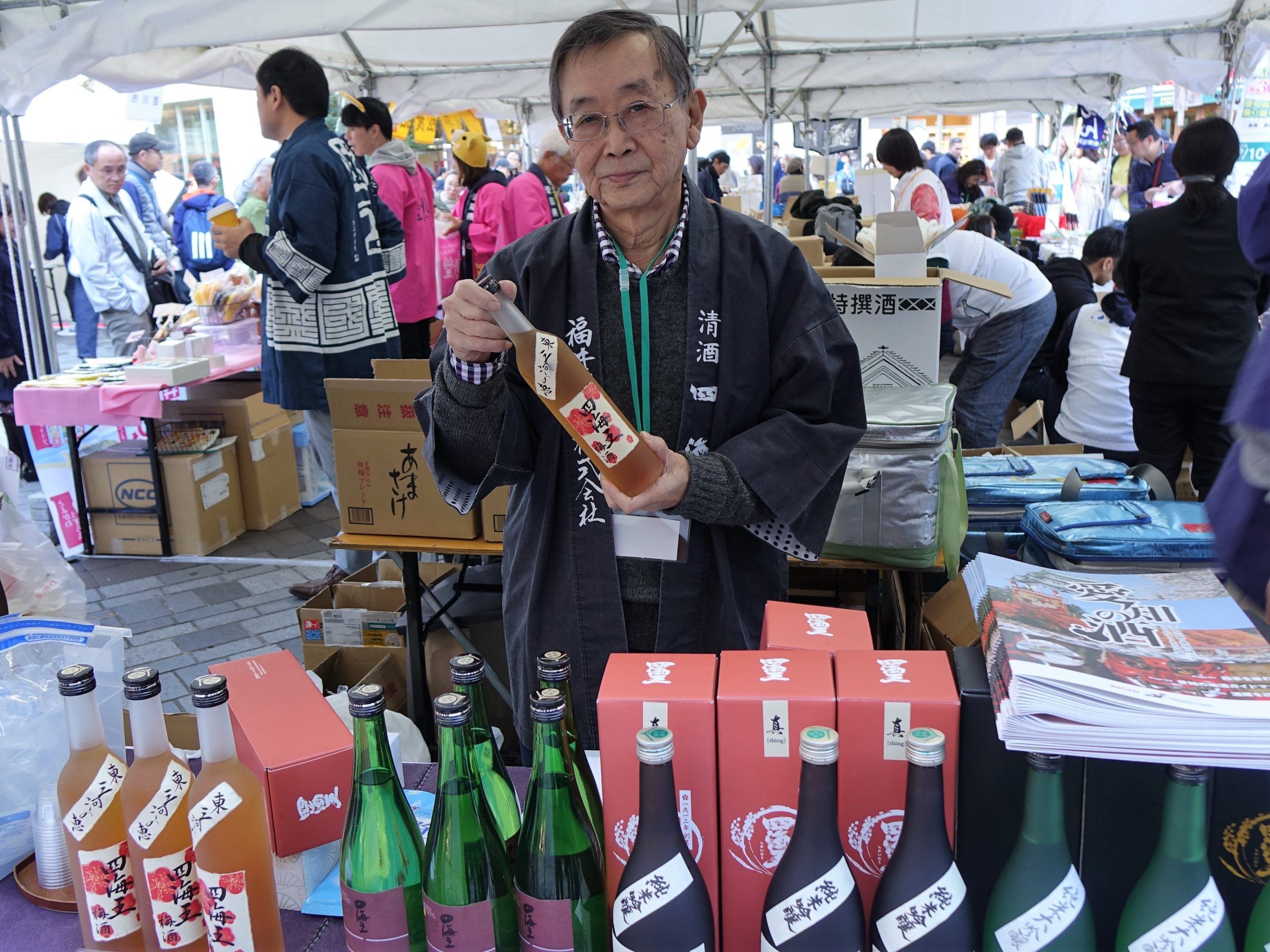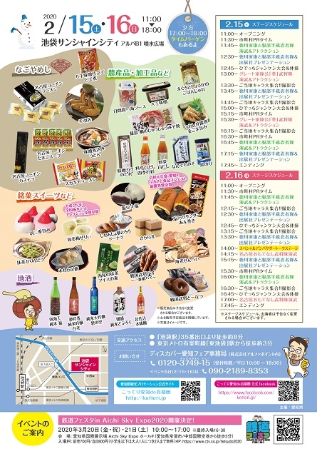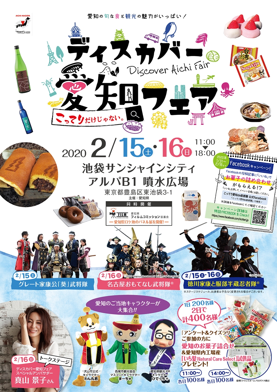 会場では八丁味噌、味噌煮込みうどん、どて煮、SUGAKIYAラーメン、名古屋コーチンラーメン、手羽先などの愛知の名産品の販売もあります。ステージでは「徳川家康と服部半蔵忍者隊®」「グレート家康公「葵」武将隊」 「名古屋おもてなし武将隊® 」の演武、スペシャルアンバサダーの真山 景子さんのトーク、ご当地キャラクター(ひでっち®、わん丸君、まーちゃ)の出演と撮影会があります。「アンケート&クイズラリー」にご参加の方に「愛知のお菓子詰め合わせ」のプレゼントもあります。あなたも寒さ知らずの屋内会場で愛知県の地酒と食をお楽しみください。