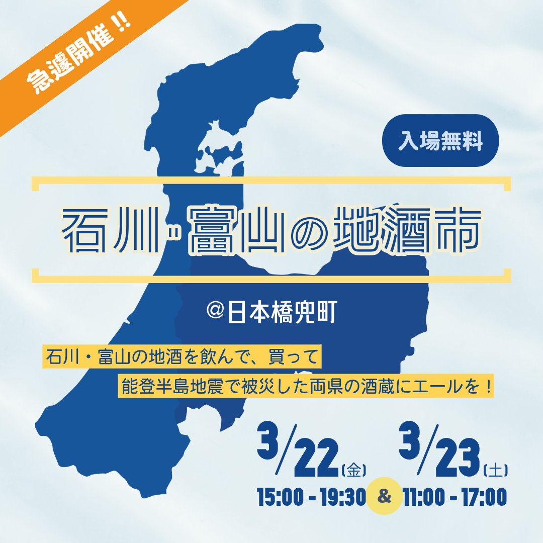 能登半島地震で被害を受けた酒蔵への支援を目的としたチャリティイベント「石川・富山の地酒市」は、3/22(金)・3/23(土)に日本橋兜町の「KABUTO ONE」で開催いたします。