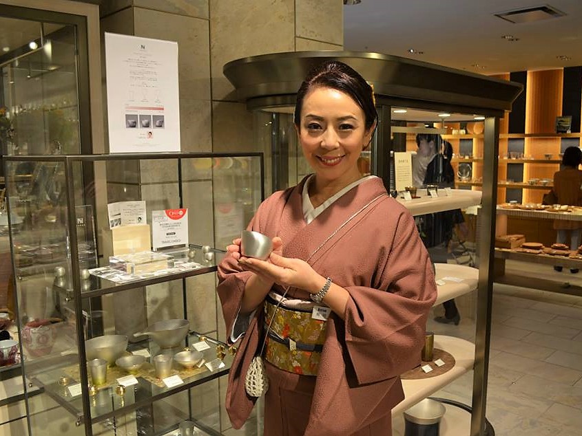 今回は、島田律子さん自らが監修して、富山県高岡のものづくり、NAGAE+(ナガエプリュス)からデビューした「TRAVEL CHOCO 旅する猪口」も店頭に並びます。桔梗の花のつぼみが開いていく様を形にしたデザインで、飲み口を変えることで、お酒の魅力を旅するように楽しめるのが特徴となっています。