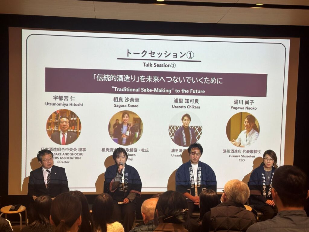 第1部では、「伝統的酒造りを未来へつないでいくために」をテーマに、若手杜氏と蔵元によるトークセッションが行われました。