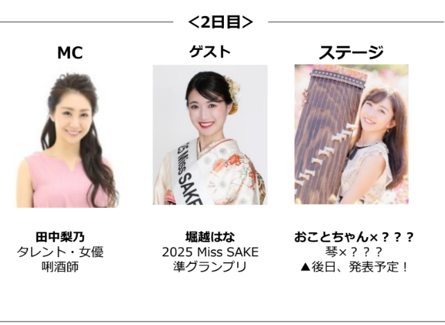 ゲストには、1日目は2025 Miss SAKE 大阪代表 / オーディエンス賞の荻野まどかさん、2日目は2025 Miss SAKE 準グランプリの堀越はなさんが和服姿で会場を彩ります。