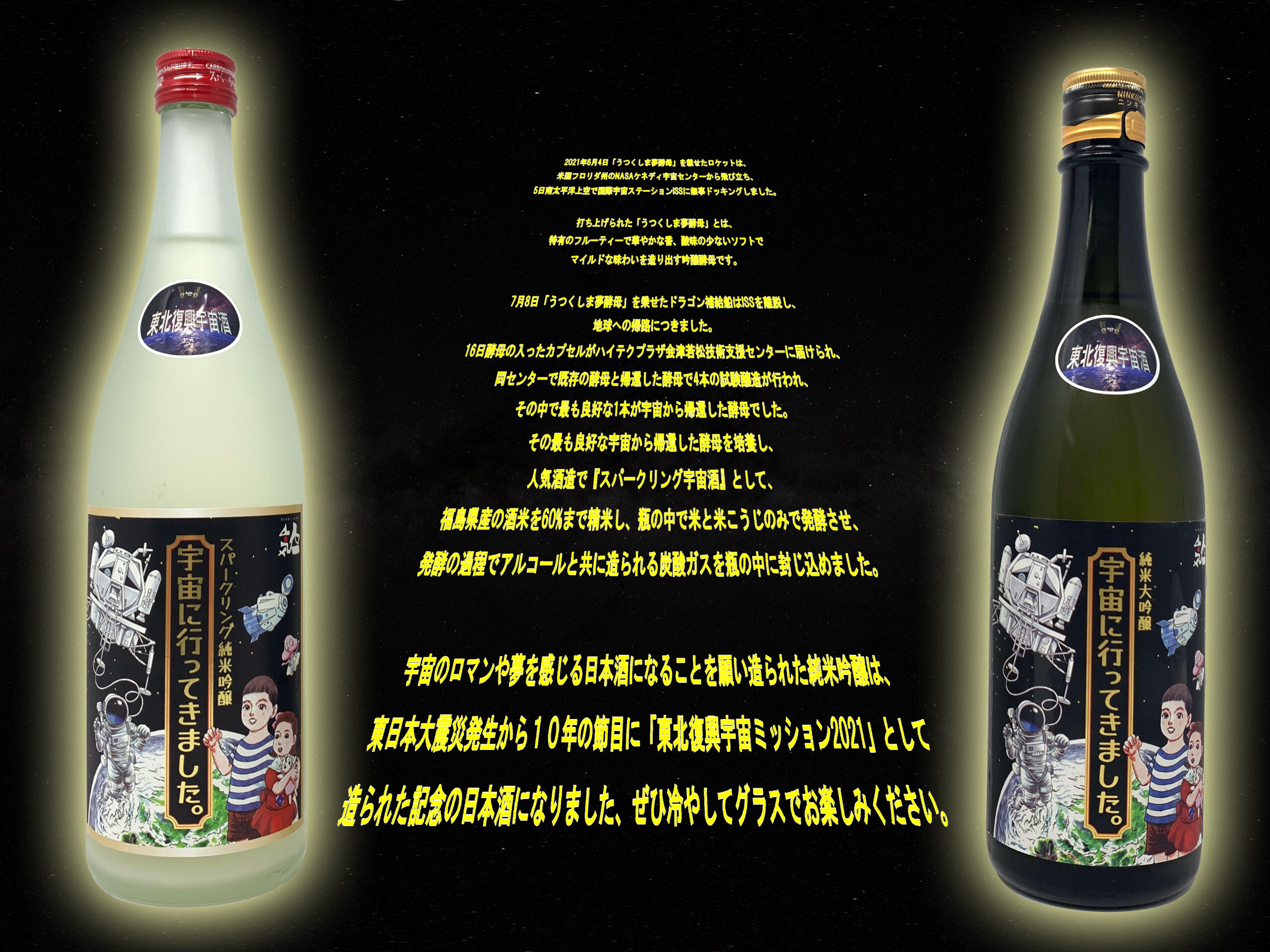 その最も良好な宇宙から帰還した酵母を培養し、人気酒造で『スパークリング宇宙酒』として、福島県産の酒米を60%まで精米し、瓶の中で米と米こうじのみで発酵させ、発酵の過程でアルコールと共に造られる炭酸ガスを瓶の中に封じ込めました。 宇宙のロマンや夢を感じる日本酒になることを願い造られた純米吟醸は、東日本大震災発生から10年の節目に「東北復興宇宙ミッション2021」として造られた記念の日本酒になりました、ぜひ冷やしてグラスでお楽しみください。
