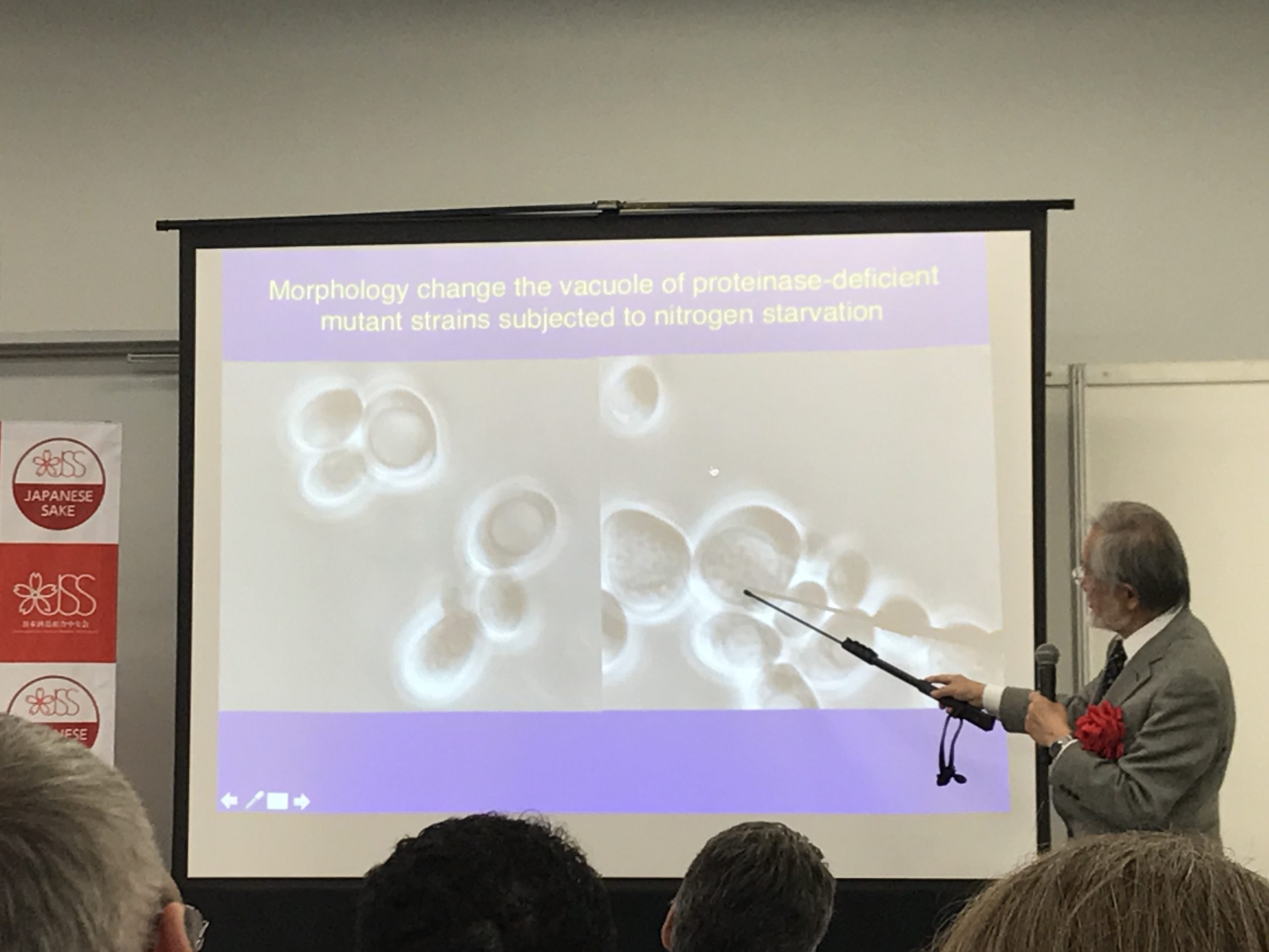 後藤奈美氏(酒類総合研究所 理事長)が、今年の全国新酒鑑評会と利き酒の仕方について説明した後、大隅良典名誉教授(2016年ノーベル生理学・医学賞受賞 東京工業大学栄誉教授)が、Yeast Autophagy(イースト・オートファジー、酵母の自食)についてセミナーが開催されました。