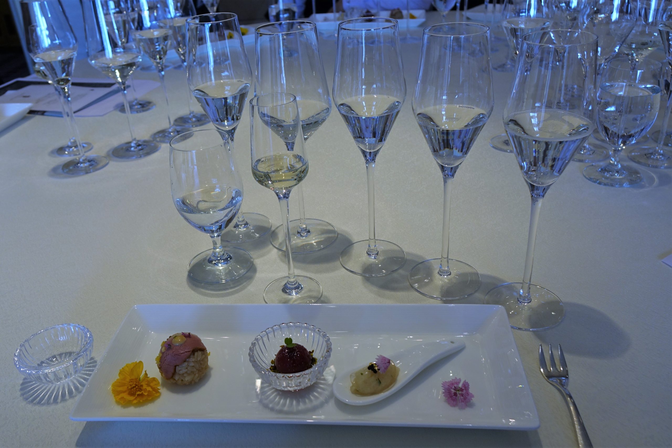 参加者は発売前の「EXPRESSION 2019」と、その母体となった25年熟成大吟醸古酒、リッツ・カールトンのフードととも味わいました。飲み比べることで、新たな息吹を吹き込まれたことを実感し、エレガントな食事とのペアリングは、軽やかなでリンゴのようなジューシー感と、シャープで洗練された後味で料理との相性が抜群でした。