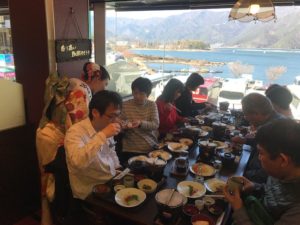 河口湖を眺めながら、特製ほうとう定食と井出酒造店のお酒のマリアージュは最高でした!