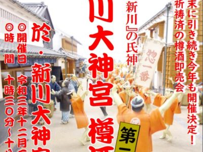 HOME > 新川大神宮 新川大神宮 「師走吉例・ 新川大神宮樽酒祭」 新川大神宮で開催!12月2... 年の瀬の2022年12月27日(火)、酒問屋の街新川の氏神「新川大神宮(中央区新川)」において、江戸下り酒の6蔵が集結し、江戸以来の風物詩である樽酒の量り売りイベント「新川大神宮樽酒祭」が開催されます ... 2022/12/15 今年も開催!第3回 新川大神宮 樽酒祭~2021年12月27... 2019年、東京都中央区新川の新川大神宮にて、開始された「新川大神宮樽酒祭」。令和の始まりを祝し、江戸期以来の新川の風物詩である、仕事納め/年越し用の下り酒の樽酒量り売りを復活させようと始められました ... 2021/12/27