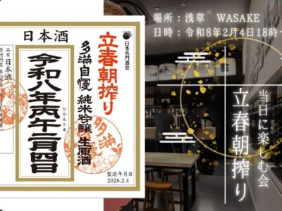 HOME > sake sake 搾りたてを当日に味わう!浅草WASAKEで年1回限定「立春朝... WASAKE Sake Expereince(東京都台東区浅草1-11-1-101)は、立春当日に搾り上げたばかりの日本酒を当日中に味わえる年1回限定イベント「立春朝搾りを当日に楽しむ会」を2026年 ... 2026/1/16 1年に1度だけの一ノ蔵特別見学ツアー募集!『一ノ蔵 立春朝搾... 株式会社一ノ蔵(宮城県大崎市松山、代表取締役社長 鈴木 整)は、2026年2月4日(水)に「一ノ蔵 立春朝搾り(※1)」の発売に合わせて、特別見学ツアーを20名様限定で開催します。 特別見学ツアーでは ... 2026/1/14 【2025年版】酒蔵プレス 今年もっとも読まれた記事ランキン... 2025年も、酒蔵プレスをお読みいただきありがとうございました。今年は全国各地の酒蔵・醸造所などの酒造りの現場や蔵元の想いを取材するとともに、それを支える人々や飲み手をつなぐメディアとして、さまざまな ... 2025/12/29 【体験レポート】「伝統的酒造り」ユネスコ無形文化遺産登録1周... 国税庁は、「伝統的酒造り」がユネスコ無形文化遺産に登録されてから1周年を迎えた節目に、記念イベントを東京・浅草で開催しました。浅草は、日本の伝統と文化が色濃く息づき、国内外から多くの観光客が訪れる場所 ... 2025/12/26 【体験レポート】KURA ONEの新プロジェクト「Re:Lo... 常温流通可能な生酒缶とともに、地域の物語を届ける日本酒ブランド「KURA ONE」。そのKURA ONEが、新プロジェクト 「Re:Local(リローカル)」 を発表しました。「地名を、味わいに。」を ... 2025/12/24 酒にまつわる大人の嗜み講座『小唄で巡る日本酒の四季』を開催!... ユネスコ無形文化遺産に登録された「伝統的酒造り」に関わる日本酒業界最大の団体である日本酒造組合中央会(以下、中央会)では、國酒の魅力に直接触れて知ることができる「日本の酒情報館(以下、情報館)」を企画 ... 2025/12/15 【体験レポート】awa酒 week at 虎ノ門横丁 202... 2025年10月22日(水)~10月28日(火)に開催された「awa酒 week at 虎ノ門横丁」に伺いました。日本酒の新しいスタイルとして注目を集める“awa酒※”の魅力を、虎ノ門横丁の参加21店 ... 2025/11/13 【体験レポート】IWC2025受賞プレミアム日本酒試飲会 ―... 野村不動産が主催する「IWC受賞プレミアム日本酒試飲会」が、2025年10月18日(土)、日本橋室町「YUITO 野村コンファレンスプラザ日本橋」で開催されました。世界最高峰のコンテスト「IWC(イン ... 2025/11/11 【体験レポート】「超吟醸祭 powered by SIPO... 全国43蔵・162銘柄が集結した、秋の日本酒フェス 全国の43蔵・162銘柄が一堂に会する日本酒フェス「超吟醸祭 ~秋の吟醸酒を味わう会 powered by SIPORY」が、2025年10月18日 ... 2025/11/6 1 2 3 … 78 Next »